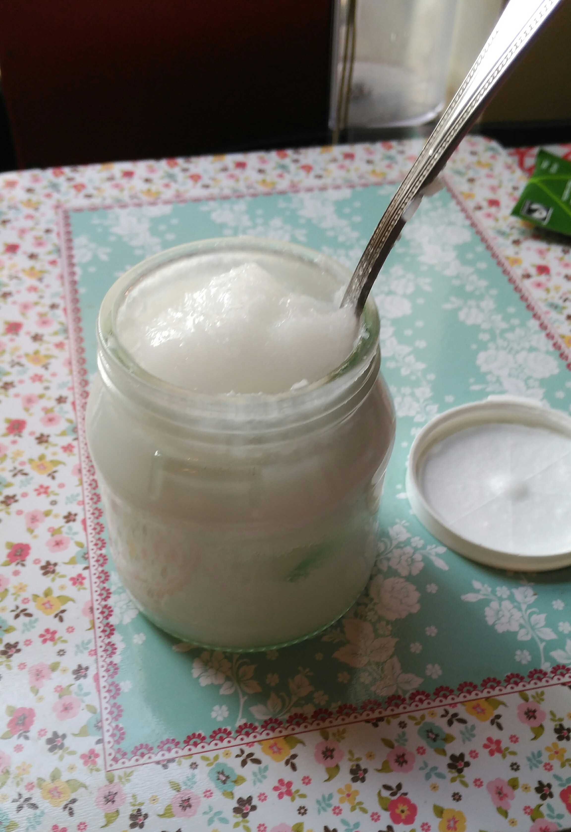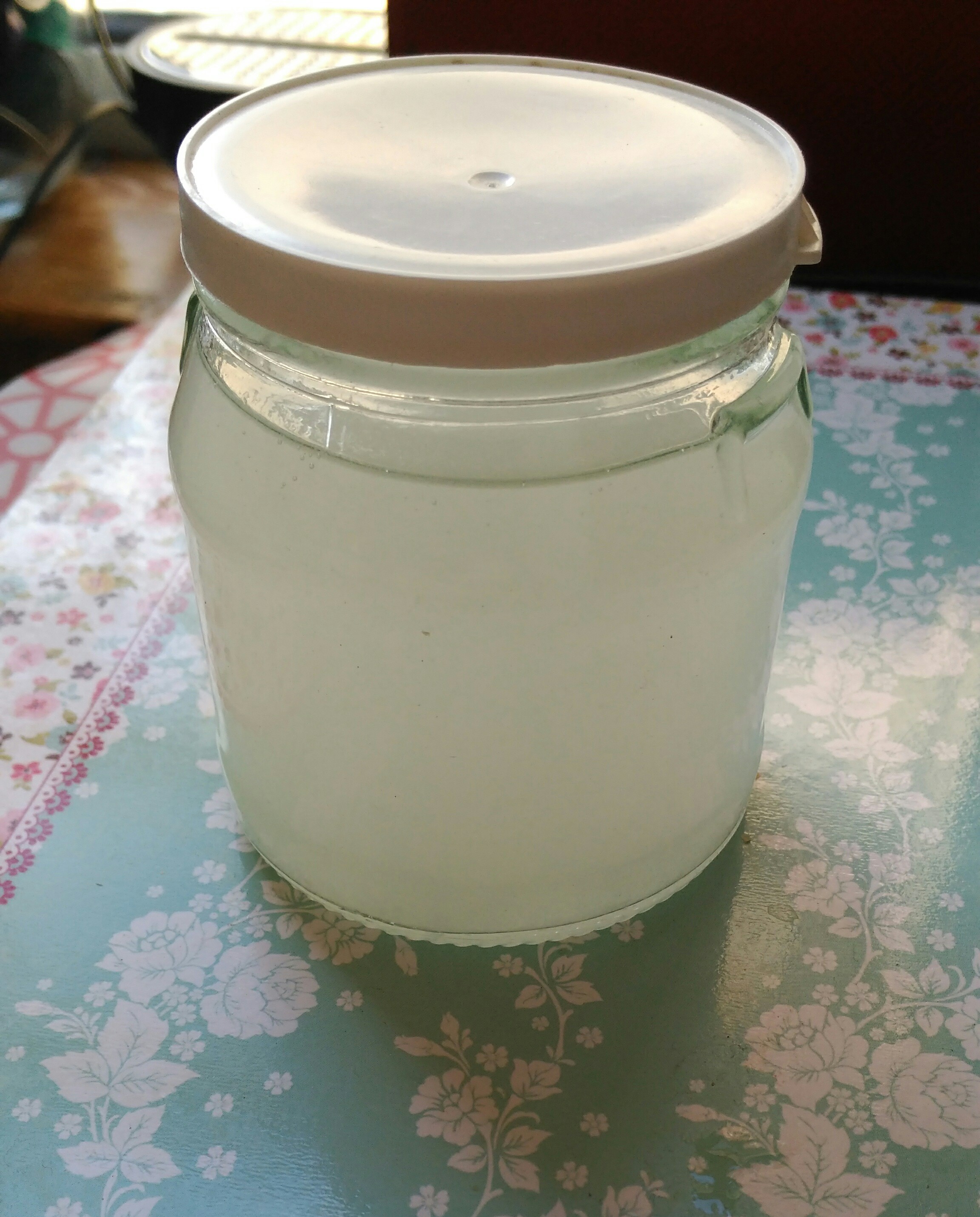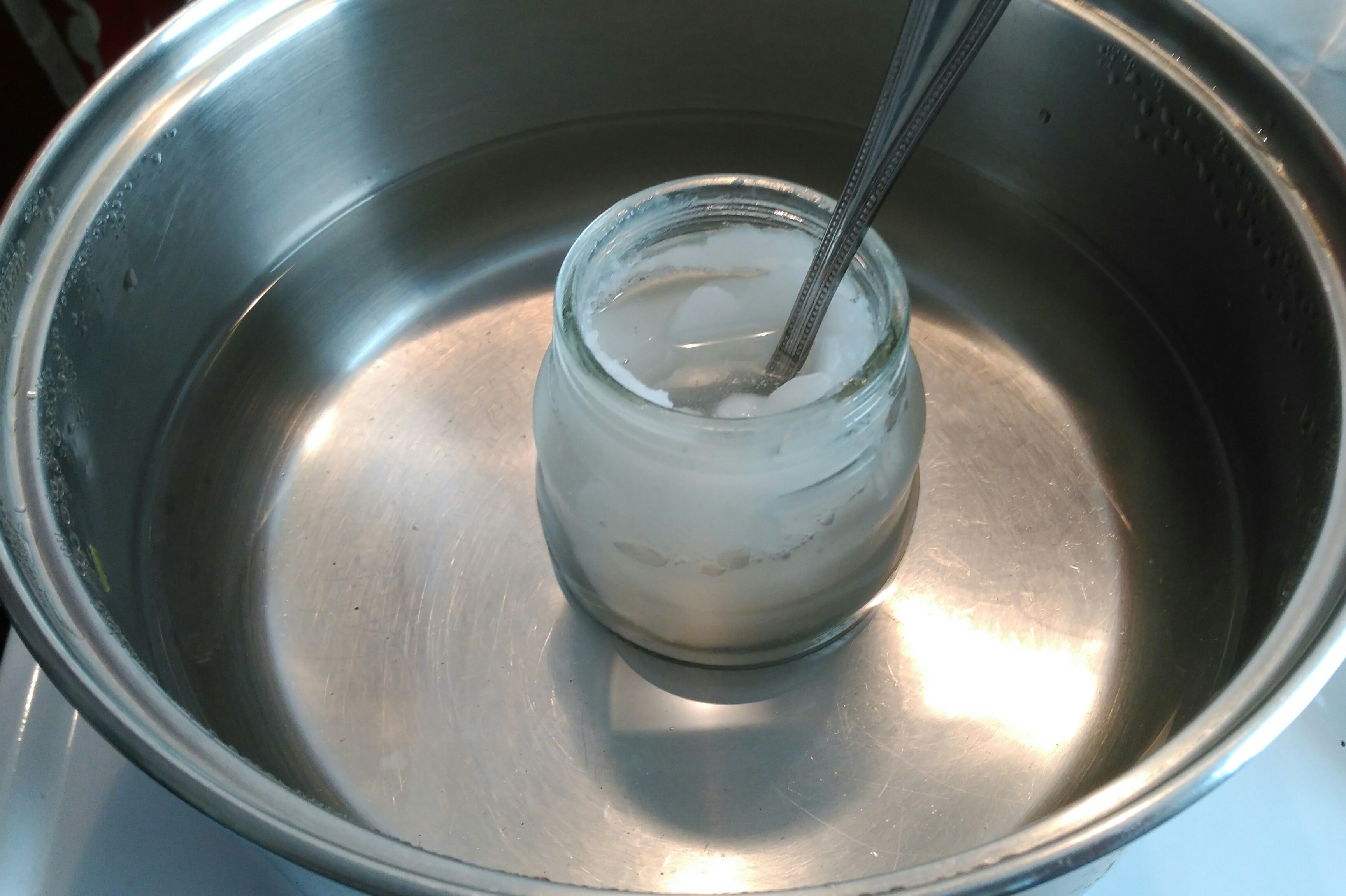 • Spoon in the solid coconut oil to near fill the jar, let it melt.